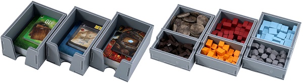 Лотки для карт рассчитаны на размещение карт в протекторах. В коробке можно разместить 13 планшетов игроков.
