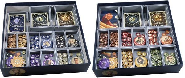 Жетоны пряностей рассортированы по номиналу, а лоток для карт расчитан на размещение карт в протекторах. У каждой фракции игроков есть свой лоток с отдельными слотами для жетонов.