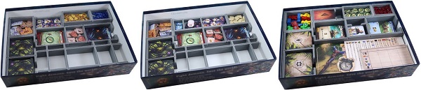 Лотки размещаются в три слоя и сверху накрываются планшетами играков, правилами и прочими компонентами. Как и во всех органайзерах от компании Folded Space после размещения всех компонентов коробка заполняется полностью, что позволяет хранить её вертикально без риска рассыпания компонентов.