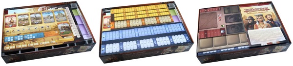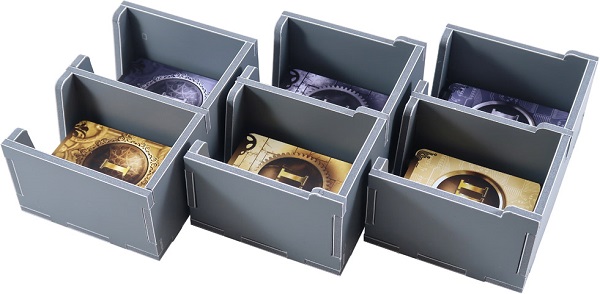 Лотки органайзера размещаются в 3 слоя, а остальные игровые компоненты выкладываются свехру лотков и накрываются правилами и игровым полем. Как и во всех органайзерах от компании Folded Space после размещения всех компонентов коробка заполняется полностью, что позволяет хранить её вертикально без риска рассыпания компонентов.
