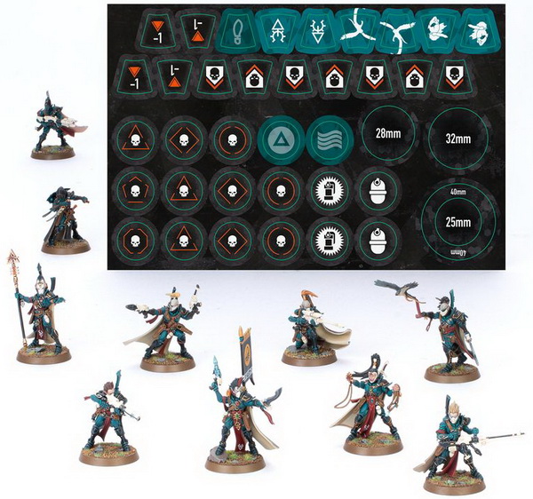 Этот набор состоит из 159 пластиковых деталей и поставляется с 10 круглыми подставками Citadel 28,5 мм. Также в комплект входит лист переноса Craftworld с 379 глифами и отметинами Aeldari.