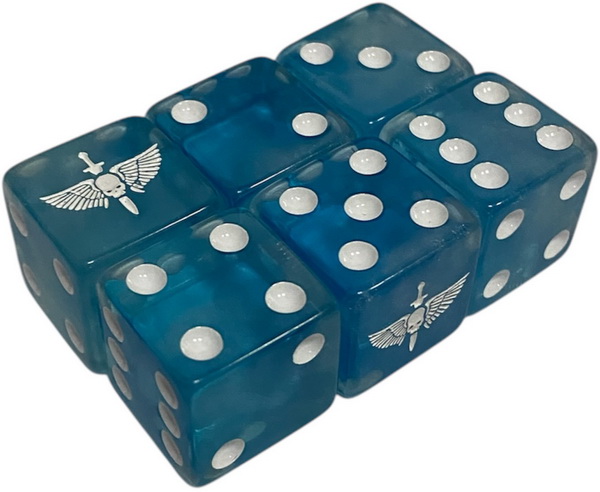 Adeptus Astartes Dice – шестигранный полупрозрачный кубик размером 16 мм x 16 мм с острыми закругленными углами, окрашен в голубой цвет с белыми маркерами. На каждом кубике изображен символ Астартес на грани вместо единицы, а на гранях 2-6 нанесены точки.