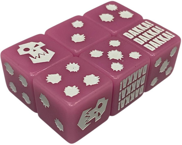 Orks Dice - шестигранный непрозрачный кубик размером 16 мм x 16 мм с острыми закругленными углами покрашен в розовый цвет с белыми маркерами. На каждом кубике изображена надпись DAKKA! DAKKA! DAKKA! на грани вместо шестерки, на гранях 2-5 нанесены символы пулевых отверстий, а на грани 1 - орочий череп.
