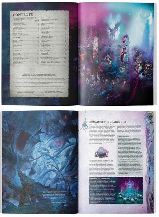 Этот мистический гримуар открывает путь к нескончаемым тайнам Великого Изменителя, предлагая исчерпывающие правила, глубокую летопись и хитроумные стратегии для управления легионами последователей Тзинча. На страницах боевого тома вы найдете подробные описания магических ритуалов, которыми колдуны и демоны переписывают судьбу Смертных Царств, а также величественные иллюстрации, олицетворяющие калейдоскопическое безумие. Книга станет вашим незаменимым проводником в большой игре, позволяя превратить каждое настольное сражение в сложный узор магии и непредсказуемых изменений. Chaos Battletome: Disciples of Tzeentch — это 106-страничное руководство в жестком переплете, содержащее актуальные правила, боевые свитки и вдохновляющие галереи для игры.Описание книги правил Chaos Battletome: Disciples of Tzeentch