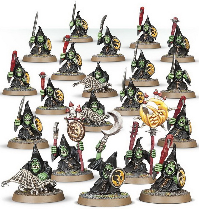 Сумрачные Поганцы (Gloomspite Gitz) - это свободная коалиция Гротов Лунного Клана, Гротов Паучьих Клыков и Трогготов, объединенных поклонением Плохой Луне вместе с Алегуццлером Гаргантом, которых привлекает предложение затеять очередное грязное делишко. Они стремятся к вечной промозглости, вечным сумеркам увлажненного блаженства, которые позволят Сумеречным Поганцам покорить поверхностные миры во имя Горкаморки.