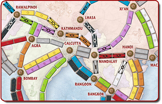 Игра на карте Легендарной Азии практически ничем не отличается от Европейской версии. По сути, это ровно те же правила, но (!) все знают, что в Азии расположены могучие Гималаи, поэтому на некоторых перегонах вы встретите значок Горных перевалов (Х).