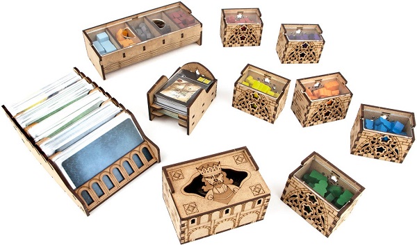 Цей органайзер дозволяє зберігати в одній коробці компоненти гри Architects of the West Kingdom доповнення Age of Artisans і промо набору. Використання цього аксесуара допоможе скоротити час на підготовку до гри і відмовитися від незручних зіп-локов. Приємним бонусом буде стилизованое під гру оформлення і акрилові кришки на лотки з токенами і робітниками. Лотки для карт розраховані на розміщення карток у протекторах. Ця модель одиноково добре підходить як для оригінальної версії гри, так і для локалізації.