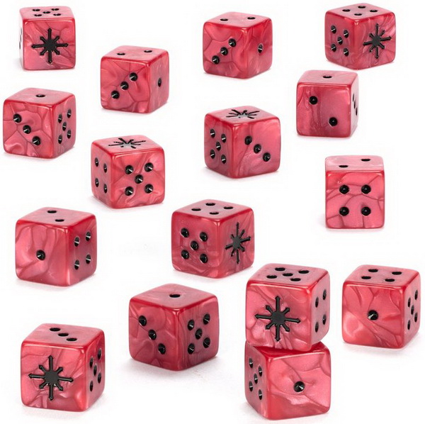 Кожен шестигранний кубик із гострими закругленими кутами пофарбований в червоний перламутровий колір з чорними маркерами. Кожен з 16 кубиків в цьому наборі має розмір 16 мм x 16 мм. На кожному кубику зображений символ Хаоситів на грані замість шістки, а на гранях 1-5 нанесені звичайні точки. Гральні кістки поставляються в картонній упаковці.