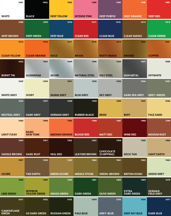 Фарби ICM на момент написання цього тексту включають 77 кольорів (серед яких 6 чистих, 10 базових, 50 відтінків та 11 кольорів металік), 3 лаки, 6 рідких ґрунтовок базових кольорів.