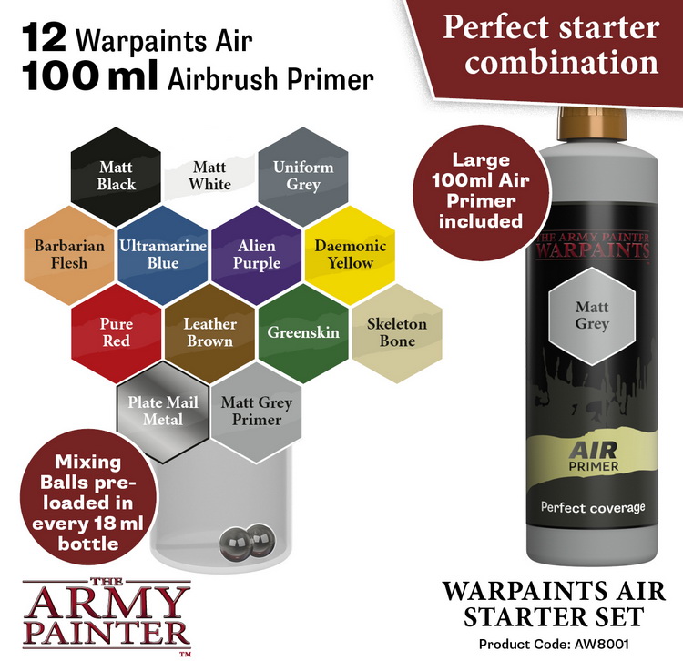 Стартовий набір Warpaints Air - відмінний спосіб почати колекцію фарб для аерографа. Завдяки вибраній початковій палітрі з найбільш підходящих і чітких колірних тонів для аерографії, набір дозволяє почати роботу з моменту його розпакування. У кожну пляшечку попередньо вкладені пара кульок для перемішування фарби Mixing Balls.