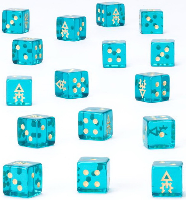 Це набір із 16 шестигранних кубиків із квадратними краями для використання в іграх Warhammer 40,000, присвячених аельдарським корсарам. Вони виготовлені з акрилового пластику кольору морської хвилі з ефектом дорогоцінного каменю та кремовими позначками, а розмір кожної грані становить 16 мм. Грані з цифрами від 1 до 5 мають традиційні позначки, а кожна грань з цифрою «6» прикрашена піратським символом Aeldari Corsairs.