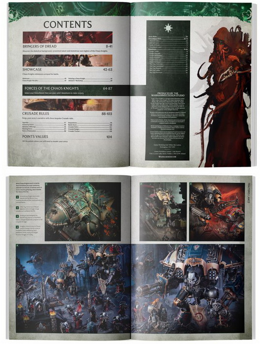 - Правила використання Лицарів Хаосу в іграх Warhammer 40,000 з чотирма Загонами та 11 технічних описів, що охоплюють доступні конфігурації