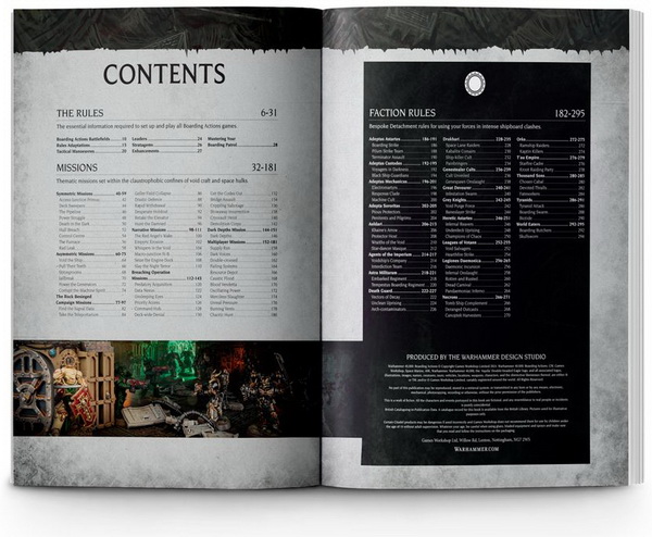 Warhammer 40,000: Boarding Actions переносить дію в тісні рамки космічних кораблів, представлених комплектами місцевості Boarding Actions. У холодній космічній порожнечі місії є критично важливими, а бойові дії відбуваються зблизька та жорстоко. У цій книзі в поточному виданні представлено місії абордажних дій і додано безліч загонів бортових дій, щоб покращити ваш досвід. Ви знайдете оновлені версії місій із серії Arks of Omen, включно з опціями для розповіді, ігор на пару та ігор для кількох гравців.