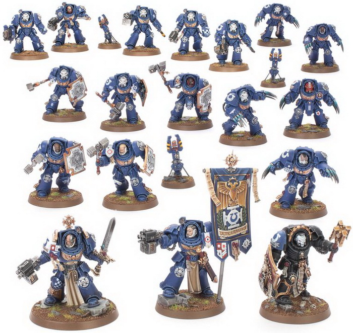 - матеріали для складання 21 мініатюр Space Marines: Battleforce – Crux Terminatus (з відповідною підставкою для кожної з них);
