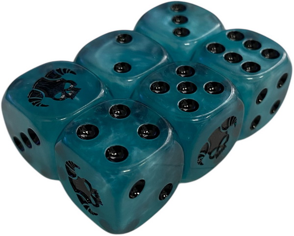 Exorcist Dice – шестигранний перламутровий кубик розміром 16 мм x 16 мм із закругленими кутами, пофарбований у блакитний колір із ченими маркерами. На кожному кубику зображено символ Екзорцистів на межі замість одиниці, а на гранях 2-6 нанесені крапки.