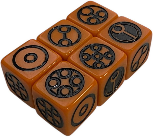Tau Empire Dice – шестигранний непрозорий кубик розміром 16 мм x 16 мм із гострими закругленими кутами пофарбований у помаранчевий колір із чорними маркерами. На кожному кубику зображено символ Імперії Тау на грані замість шістки, а на гранях 1-5 нанесено стилістично оформлені кола.