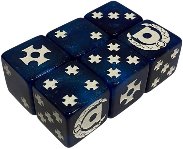 Ultramarines Pearl Glitter Dice – шестигранний перламутрово-блискучий кубик розміром 16 мм x 16 мм із гострими кутами, пофарбований у синій колір із білими маркерами. На кожному кубику зображено символ Ультрамаринів на грані замість шістки, а на гранях 1-5 нанесені хрести.