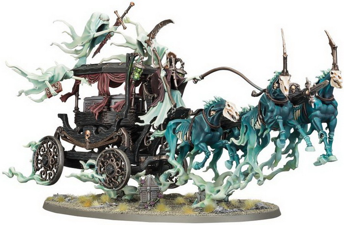 Цей набір містить компоненти, необхідні для складання Чорного Диліжанса. Виготовлений з важких дерев'яних панелей із заклепками, що напружуються проти ефірної сили всередині, це похоронний диліжанс, штори якого зав'язані назад, роблячи видимою жахливу труну всередині; у ньому знаходиться зв'язаний вампір, якого можна побачити, якщо ви вирішите змоделювати труну зі знятою кришкою. Колеса викувані з вишуканого заліза – 2 маленьких колеса спереду, 2 більших колеса ззаду – з черепами та пісочними годинниками, символічно розкиданими навколо, що представляють смерть. 3 Носії Реліквій мчать поруч з Каретою, несучи меч, книгу та келих – особисті речі вампіра, якого перевозять. Карету вперед веде Привид Каірна, якого можна зобразити в капюшоні або короні – він може носити хватку душі, косу женця або бути зобразений з порожніми, жестикулюючими руками. 4 Найтмери тягнуть Карету, яку несуть угору на струмках ефірної енергії – 2 передні Найтмери носять величезні похоронні герби з шипами.