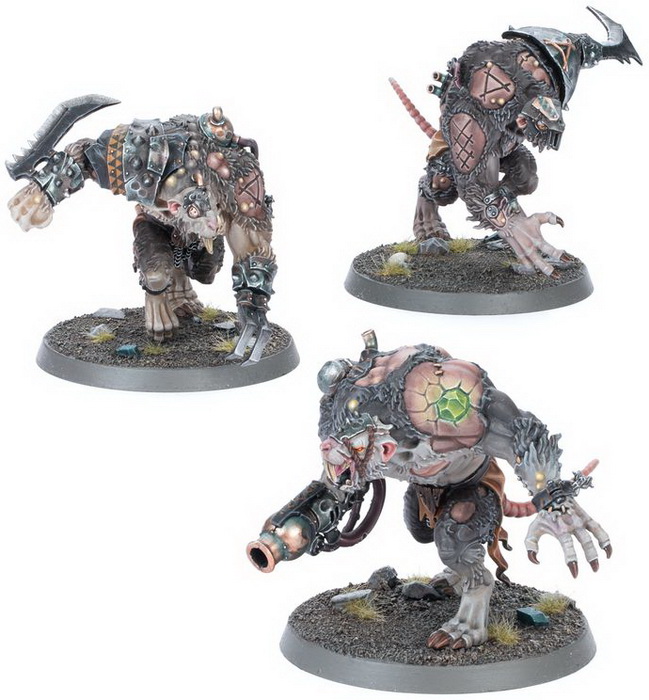 Цей набір дозволяє зібрати трьох Rat Ogors, шалених ударних військ для вашої орди Скавенів. Ви можете озброїти одного з цих величезних монстрів варп-гарматою, а також вибрати для кожного з них голову з шоломом або без нього.