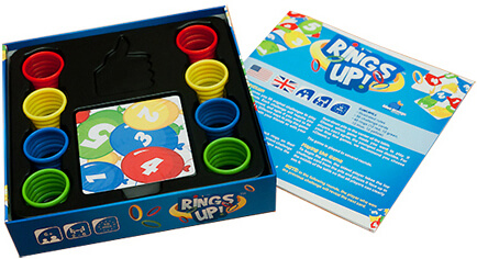 Учасники настільної гри Rings Up (Різнокольорові колечка) будуть змагатися у спритності одягання кілець на свої пальці. Для гри потрібна уважність і швидкість. Ах да, ще обов'язково потрібен хоча б один палець на руці кожного учасника (усмішка). Дуже весела гра, близька за духом до таких, як Доббль або Швидерця.