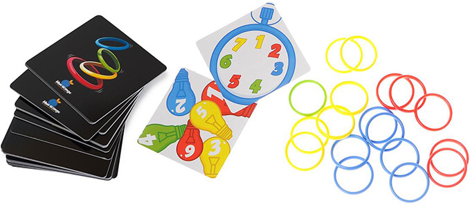 Відкривайте коробку, діставайте різнокольорові колечка, а колоду карт із завданнями перетасуйте і розмістіть по центру столу сорочкою вгору.