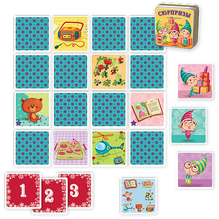 Сюрпризи – це настільна гра на розвиток пам'яті. Учасники відкривають картку з іграшкою, запам'ятовують що на ній зображено, закривають і т. д. Але не подумайте, що це чергова мемо-гра, яких дуже багато. Сюрпризи виділяються від інших подібних ігор, наявністю персонажів – Ельфів зі своїми унікальними здібностями, які можуть використовувати гравці. Додамо пару хороших слів про оформлення карт, які вийшли дуже яскравими і красивими, а також не забудемо і про мега-компактні розміри гри, що дозволить взяти її з собою куди завгодно.Опис настільної гри Сюрпризи