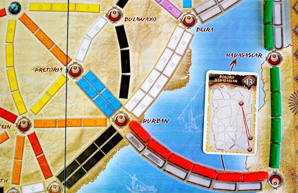 Якщо карта квитка на поїзд з'єднує материкову частину Африки з Мадагаскаром, то гравцеві достатньо привести свої вагони лише в один з двох міст.