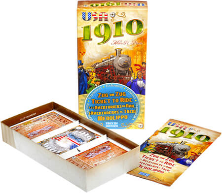 Ticket to Ride: USA 1910 – це доповнення до базової гри Ticket to Ride: Америка. Нові картки, три нові варіації правил гри, крім базових, а також нові бонусні карти. Увага! Використовувати цей додаток можна лише при наявності гри Ticket to Ride: Америка.