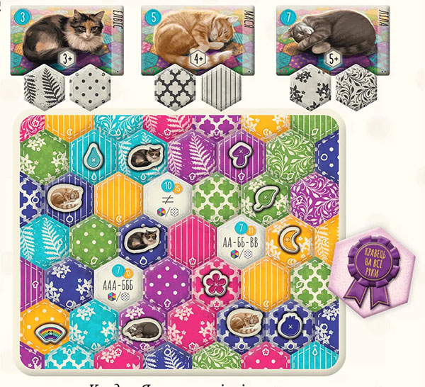 А це означає, що певному пухнастику подобається певний тип візерунка. Тому поряд з кожним хвостатиком випадковим чином розміщується по 2 жетони, які визначають його вподобання. На жетоні котика є малюнок, який вам потрібно зібрати з клаптиків з вищезазначеними візерунками.