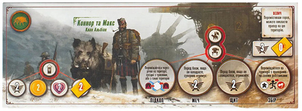 - Щит: перед битвою, якщо ви захищаєтеся, отримаєте 2 сили. Це відзначається на треку сили. Властивість застосовується раз за битву;