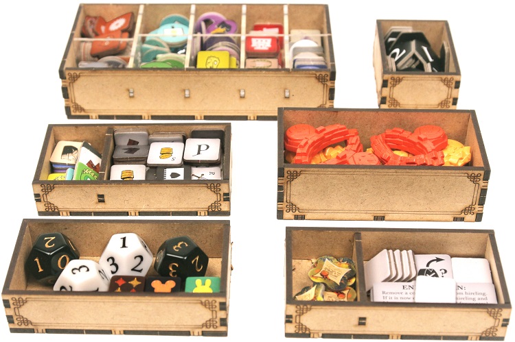 Органайзер розрахований на розміщення компонентів базовой игры Root та доповнень: The Underworld, The Riverfolk, Marauder, Landmark Pack, Vagabond Pack, The Exiles and Partisans Deck, The Clockwork, The Clockwork 2, Marauder Hirelings Pack & Hireling Box, Riverfolk Hirelings Pack, Underworld Hirelings Pack. У лотках для карт передбачено місце для протекторів до 60 мікрон.