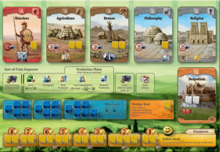Каждый игрок получает личный планшет, который в себе содержит всю необходимую информацию о состоянии вашей Цивилизации: государственный строй, построенные городские постройки, уровень развития сельского хозяйства и производства, уровень коррупции, продовольственное потребление и лояльность нации к правительству.