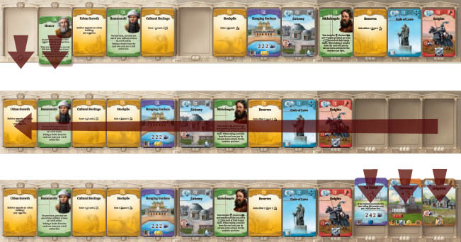 Каждый игрок в зависимости от эпохи выполняет доступные ему действия и передает ход следующему игроку. В процессе своего хода игроки за очки действий выбирают себе карты из предложенного ряда (13 шт). Каждый новый ход частично обновляет этот ряд. Таким образом, игра переходит из одной эпохи в другую.