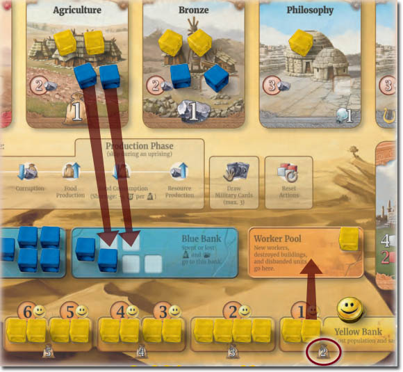 Привлеченные население на работы требует повышение уровня лояльности (настроение нации), а также дополнительных продовольственных затрат. Для покрытия продовольственных затрат потребуется произвести еду на фермах и оплатить в нужном количестве. Аналогично добываются и поставляются ресурсы для строительства зданий и чудес света. Если лояльность населения не будет обеспечена - ждите восстания. Будьте готовы к потерям ресурсов в результате коррупции, если вы их не используете, а накапливаете для каких-то целей.