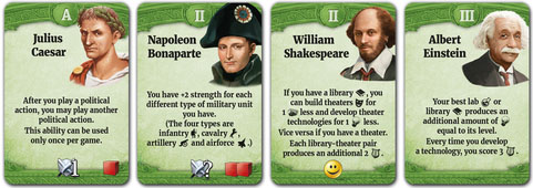 Но Лидеры не вечные и на их место обязательное придут другие. Будьте готовы к различным поворотам, которые подбросит вам игра через карточки событий. Способность подстраиваться под любую ситуацию - отличный шаг к победе в игре. Но будьте уверены, что ваши успехи всегда будут сопровождаться агрессией со стороны других наций. Так же всегда учитывайте возможность объявления вам Войны другим игроком...