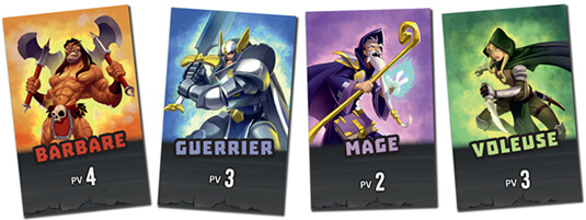 Случайным образом или сообща определите, какой из персонажей отправится в подземелье в этом раунде. Всего в игре 4 персонажа: Варвар, Воин, Маг и Мошенник.